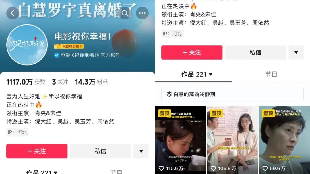 《祝你幸福!》社會性的選題與戲劇性的內容,本身適合進行短視頻傳播。而其官抖播放數據也不算弱,粉絲數與點贊數均超過《出走的決心》。抖音話題播放量也有14.4億,按道理而言,其熱度應是中秋檔的第二,然而流量上的曝光卻無法轉化為票房成績。