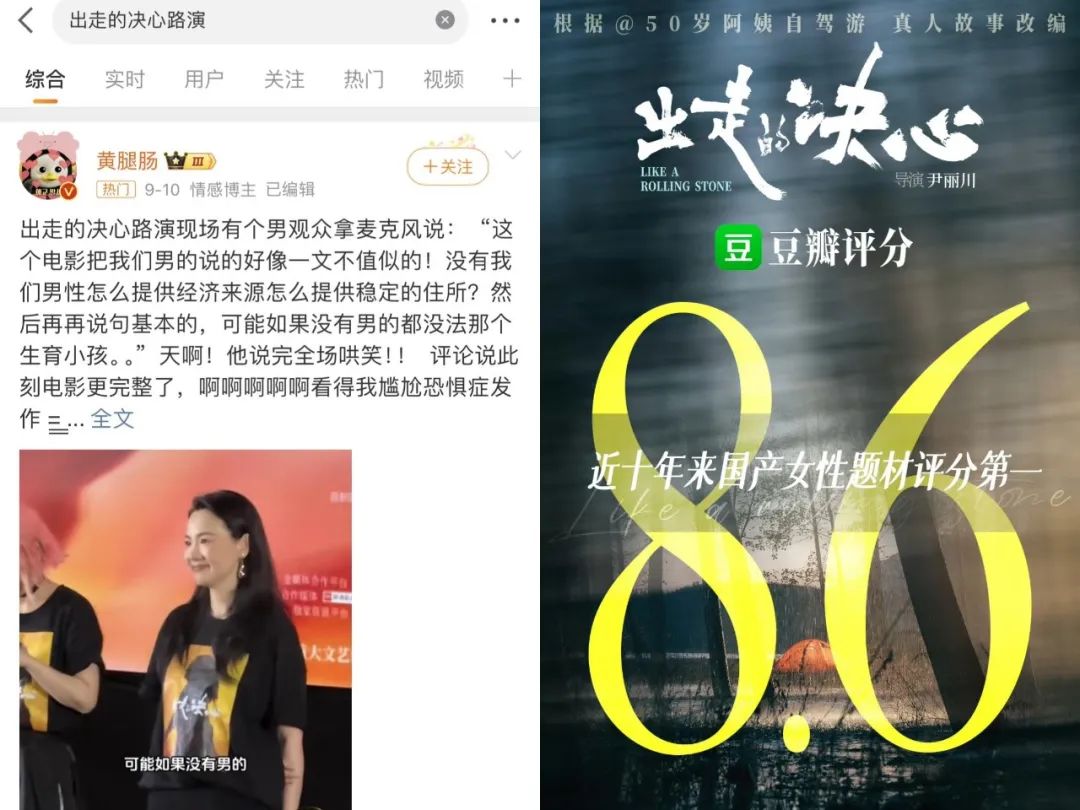 《出走的決心》在話題營銷上的力度有所不足。實際上,在映前路演階段,觀眾提問環節中所出現的性別對立發言,曾短暫地獲得小範圍的討論。但很明顯這一路徑火藥味太重,有被輿論反噬的風險。片方於後期還是選擇更安全的打法,專注於“做自己”“自愛”等女性自強口號。