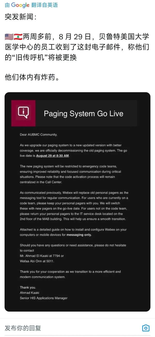 不過,以色列方面拒絕評論此事。美國務院否認三連:不清楚、沒參與、不評論。而實際上,黎巴嫩貝魯特美國大學中心醫療中心在前幾周剛發的通知,不允許在醫院內使用新進口的尋呼機設備。要説不知情,顯然説不過去。