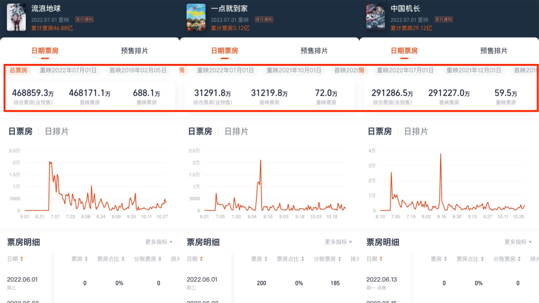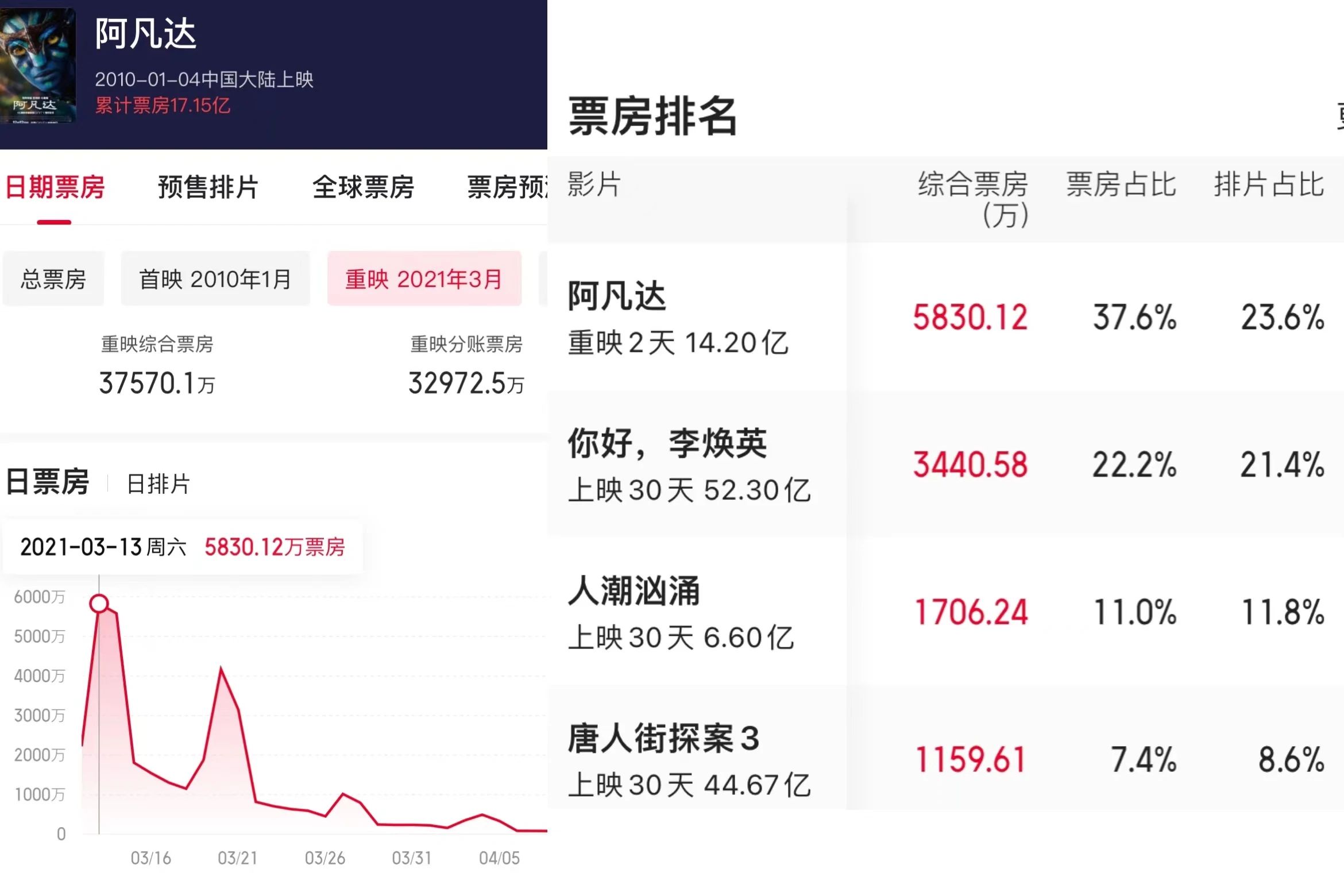 排片也不再受限,如2021年重映的《阿凡達》,重映第二天就以23.6%的排片佔比超過同期霸佔榜首的《你好,李煥英》成功登頂,最後拿下3.75億票房成績,甚至高出許多同期上映的新電影。