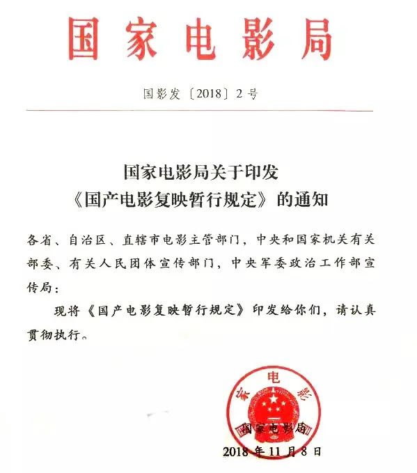 於是這一規定首先從時限上對復映片作出定義,即距首次公映結束超過兩年再次進行發行放映的國產電影;其次強調電影復映應嚴格保護各版權相關方合法權益;第三規定復映片必須重審;最後限制復映影片上映範圍不能超過2500家影院,每家影院只能有1個影廳排映。