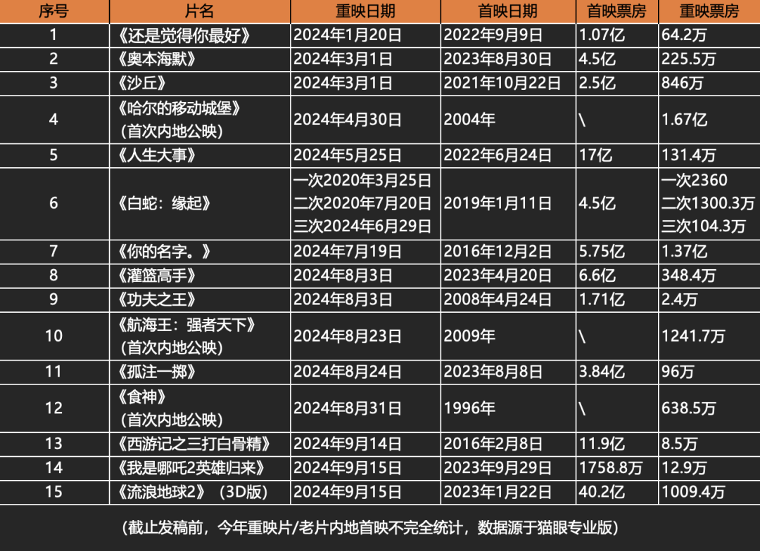 但重映片不能走向“湊數品”。由於去年中國電影市場存量幾乎消耗殆盡,今年電影庫存更加捉襟見肘,重映片相較上一年肉眼可見地多了起來,但效果也不盡如意。除了《你的名字》,《奧本海默》《沙丘》等重映片都沒有破千萬,《孤注一擲》連百萬都不到,《功夫之王》只有2.3萬,而這些作品在首映時都是過億之作。
