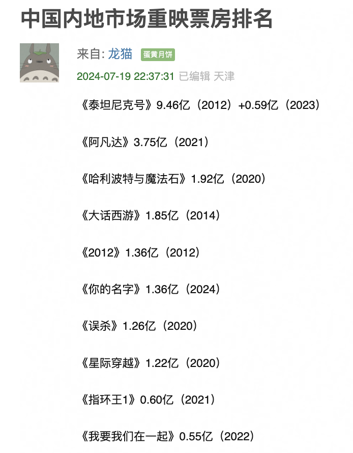 從商業價值來看,國內重映票房榜前十名,是《泰坦尼克號》《阿凡達》《哈利波特與魔法石》《大話西遊》《2012》《你的名字》《誤殺》《星際穿越》《指環王1》《我要我們在一起》,不外乎是有着全球影響力、視效突出的外國進口大片,或具有粉絲基礎的日本動畫電影、香港經典老片。