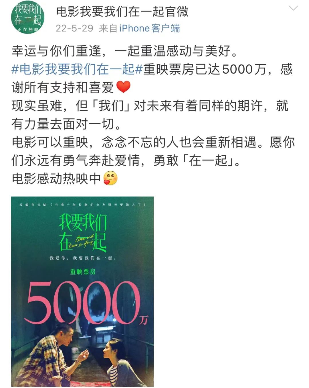 《我要我們在一起》曾是2021年“520”檔期的票房冠軍,次年同檔期再次重映,重映首日就拿下42.2%日票房大盤佔比,這一成功很大程度上得益於同檔期沒有其他競爭對手,在它之後的下一部愛情片,是半個月後才上映的《暗戀·橘生淮南》。