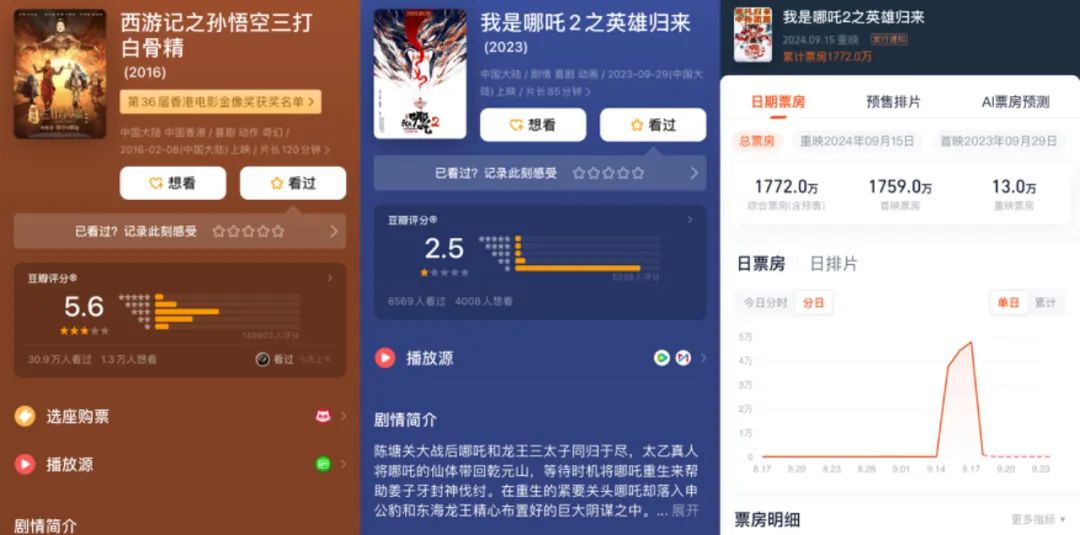 另外兩部則讓人有些丈二和尚摸不着頭腦。一部是2016年春節檔上映的《西遊記之三打白骨精》,豆瓣評分5.6。不少其它媒體將這一重映動作評價為“蹭《黑神話:悟空》熱度”。