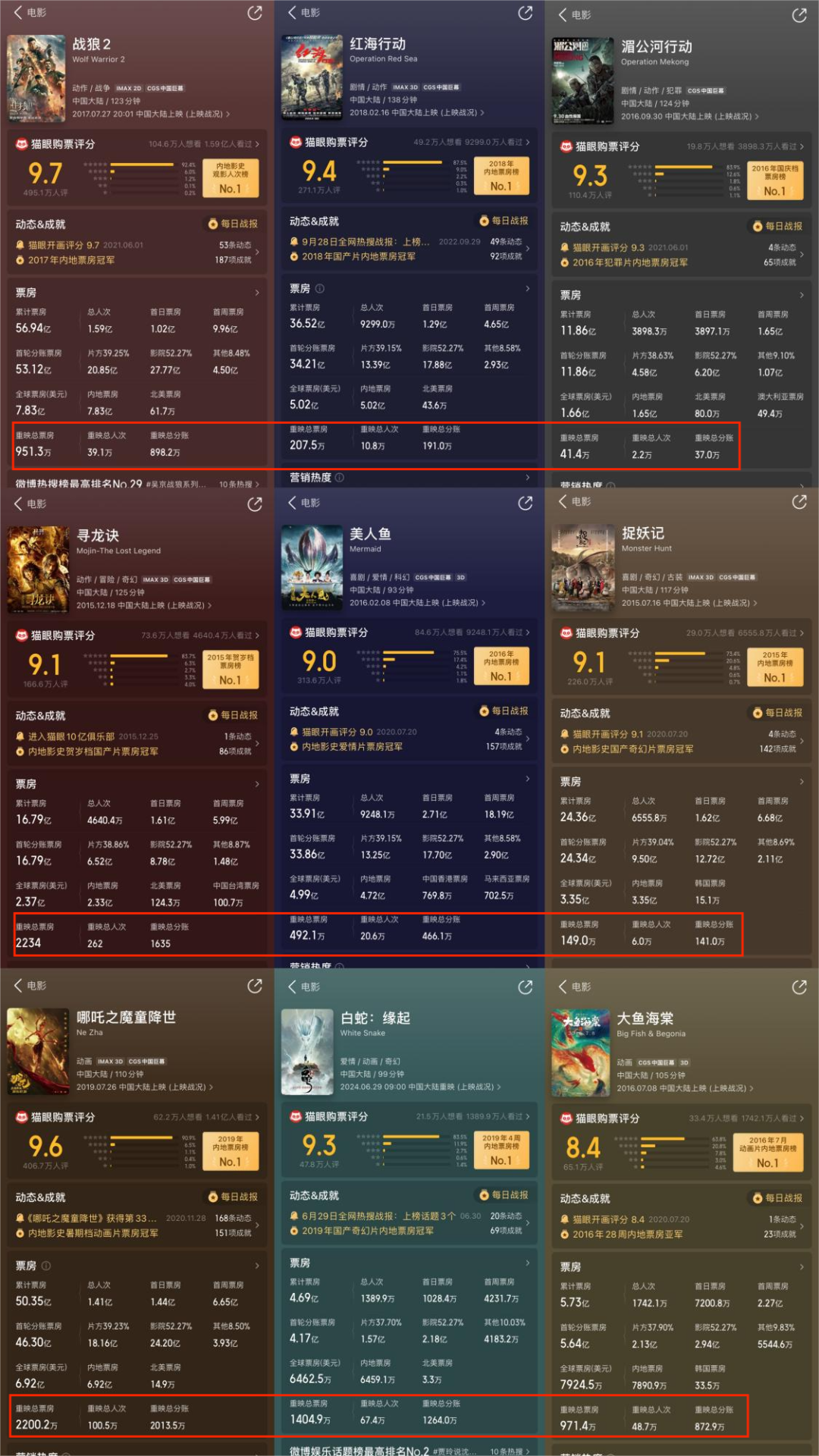 國產片裏,有《戰狼2》(951.3萬)《紅海行動》(207.5萬)《湄公河行動》(41.4萬)這類主旋律氣質的新主流大片,有《尋龍訣》(2234)《美人魚》(492.1萬)《捉妖記》(149萬)這類商業類型片,還有《哪吒之魔童降世》(2200.2萬)《白蛇:緣起》(1404.9萬)《大魚海棠》(971.4萬)這類表現突出的國漫大作。