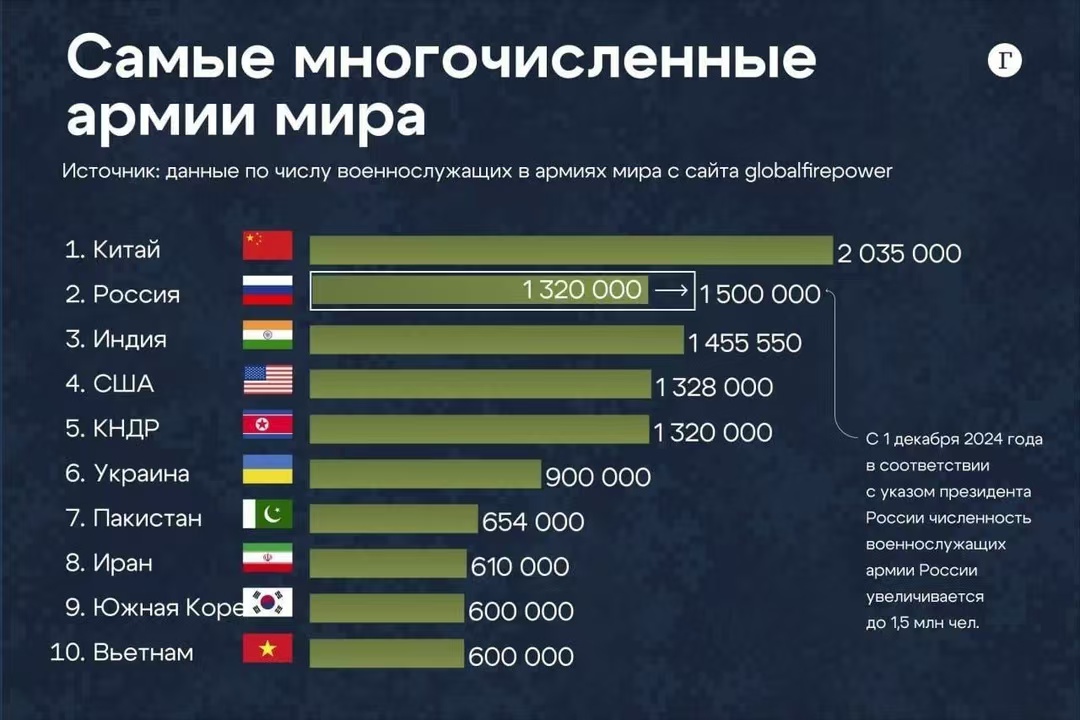 俄羅斯總統普京於2024年9月16日簽署命令,要將俄羅斯武裝力量人數從大約220萬人增加至2389130人,其中包括150萬現役軍人。