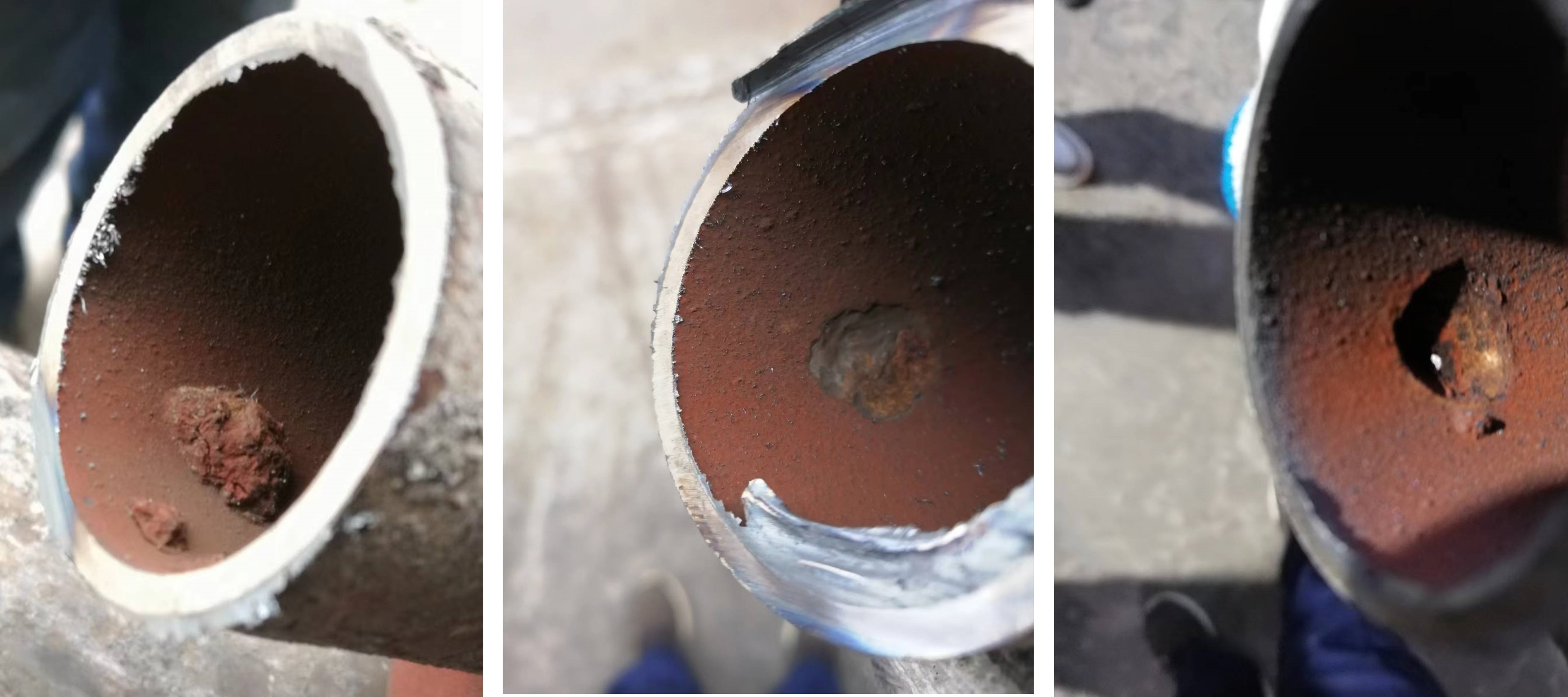 ▲典型鍋爐管****道腐蝕產物氧化鐵垢及垢下腐蝕坑和坑蝕穿孔,看到穿孔了嗎?