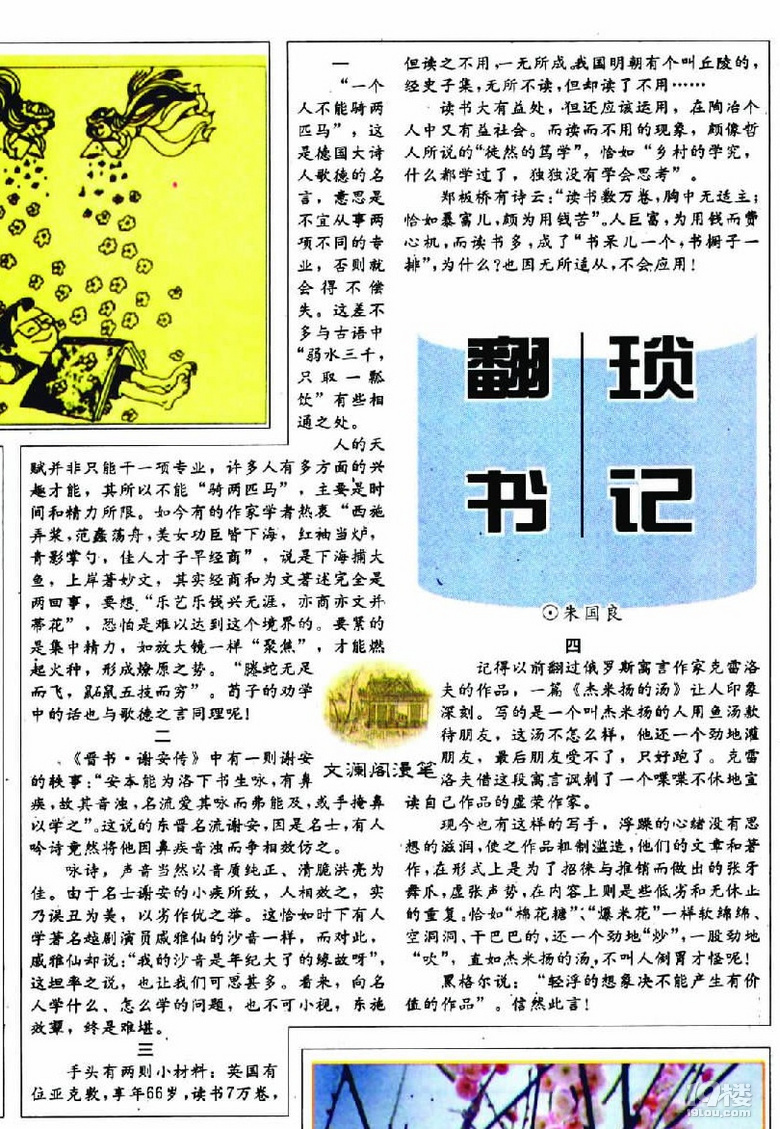 “一個人不能騎兩匹馬,這是德國大詩人歌德的名言,一個人不能同時趟兩條河,這又是古希臘哲學家的勸道。意思是不宜從事兩項不同的專業,否則就會得不償失。這差不多與古語中弱水三千,只取一瓢飲有些相通之處。人的天賦並非只能幹一項專業,許多人有多方面的興趣才能,其所以不能騎兩匹馬,主要是時間和精力所限。如今有的作家學者熱衷西施弄槳,范蠡盪舟,美女功臣皆下海,紅袖當壚,青影掌勺,佳人才子早經商。説是下海捕大魚,上岸著妙文,其實經商和為文著述完全是兩回子事,要想樂藝樂錢興無涯,亦商亦文並薺花,恐怕是難以達到這個境界的。要緊的是集中精力,如放大鏡一樣聚焦,才能燃起火種,形成燎原之勢。塍蛇無足而飛,鼬鼠五技而窮。苟子的勸學中的話也與歌德之言中西碰撞、同義同理呢!”
