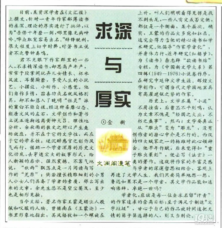 妙筆間左右逢源而信手拈來,駢散交錯,充滿文化隨筆小品的知識含量且筆含風趣。金文《求深與厚實》亦由某資深學者在《文匯報》刊文針對一青年鄙薄讀書的求深、理論的厚實展開批評入筆,引出“時下作家羣裏的一些人,不思精深讀書,卻想高產豐產”卻“不知已落入了晚明性靈派的窠臼”,引出餘秋雨散文成功之道不在於文學性,而在於學術性,“倘若擅長精雕細琢的小女人小男人們具備了餘先生的學養,那麼寫出來的文章,餘先生如果不是望塵莫及,至少也會相形見絀”,因而形象生動地指出“不客氣地講,秋雨飄落點是一片閲讀與寫作的荒原”,進而作為比照,筆鋒一轉而又引出“當今文壇,作家王蒙是個值得欽佩的人物”,歷數其包括研究《紅樓夢》、為《中國新文學大系》寫序等表現,充分肯定“作家學者化”之必要,並隨機穿插“歷史上,文學本屬小道不屑掛齒,後曹丕不平則鳴,提出經國之大業、不朽之盛事”,以及漢代揚雄決然摒棄童子雕蟲篆刻、一改文風的故事,發出了“我們只要簡單想一想,魯迅如果不是一個學者,其作品能如逸響偉辭、卓絕一世嗎”的扣問。行文如行山陰道上,仄仄、盤繞、延伸而引人入勝。這種收放裕如的文法,實與朱先生可謂同出一源,難怪乎深得作為責編的朱先生青睞而第一時間刊發。