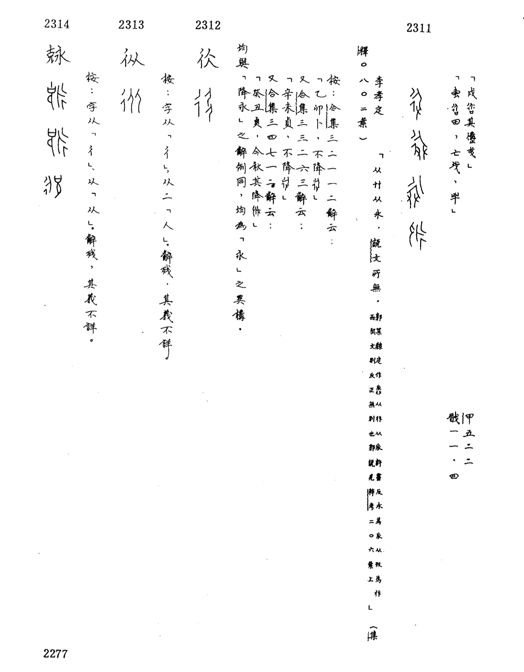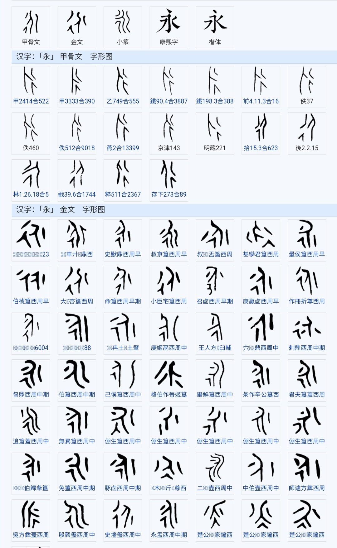 甲骨文、金文、石鼓文【永(彳人)、行(行人)、彶(彳人又)、道導(行刀、行首止、行首又)、從(彳從、彳仌)、派(彳介、彳人水)、詠侃(介口、彳人口、彳介口)、彷䢍(行方、行人止、行方止)】互為異體分化字。詞例:帝降永(帝降彶)。令永、永㚔、永弗其㚔。今日永於。才(在)永、步於永、永方。王永(侃)、永(侃)王。令冓以多馬彷(訪or防)。
