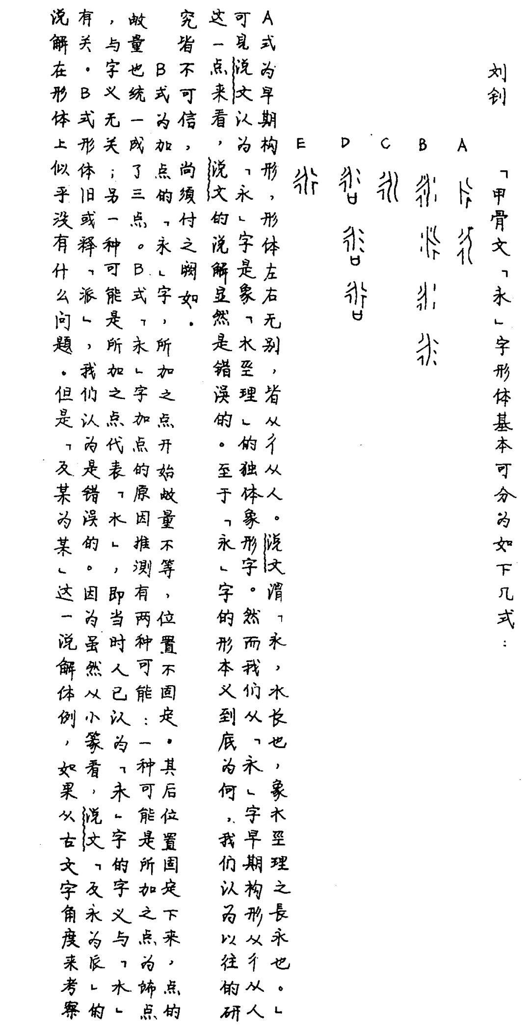 金文【永】字形彎曲,象徵邊疆山路崎嶇。於是誤解為江水永長。衍生泳字,游泳。