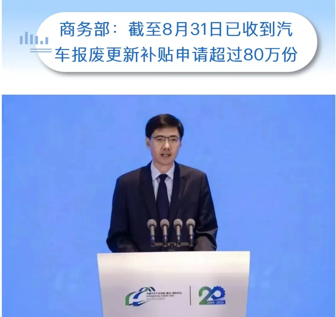 一是政策因素,報廢更新和以舊換新的政策影響。8月新能源零售環比7月增速17%,體現出國家報廢更新政策的良好市場反饋。截至8月31日上午10點,已經收到汽車報廢更新補貼申請超過80萬份。由此測算8月下半月單日新增報廢更新已超過1.33萬份,充分體現了報廢更新政策的拉動作用效果喜人。