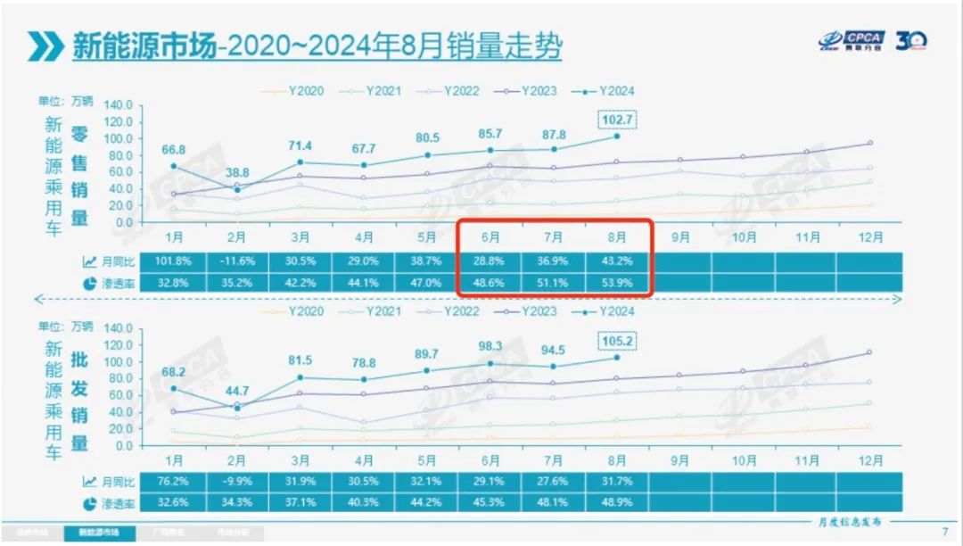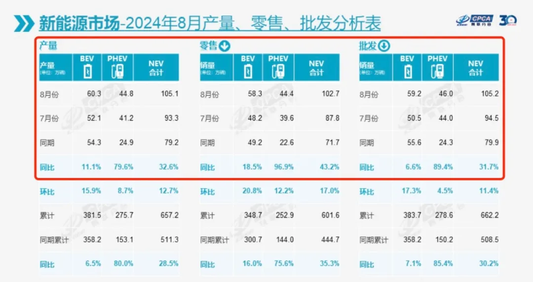具體到8月份,生產105.1萬輛,同比增長32.6%;批發銷量105.2萬輛,同比增長31.7%;市場零售102.7萬輛,同比增長43.2%。