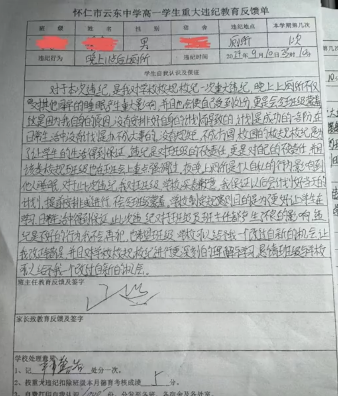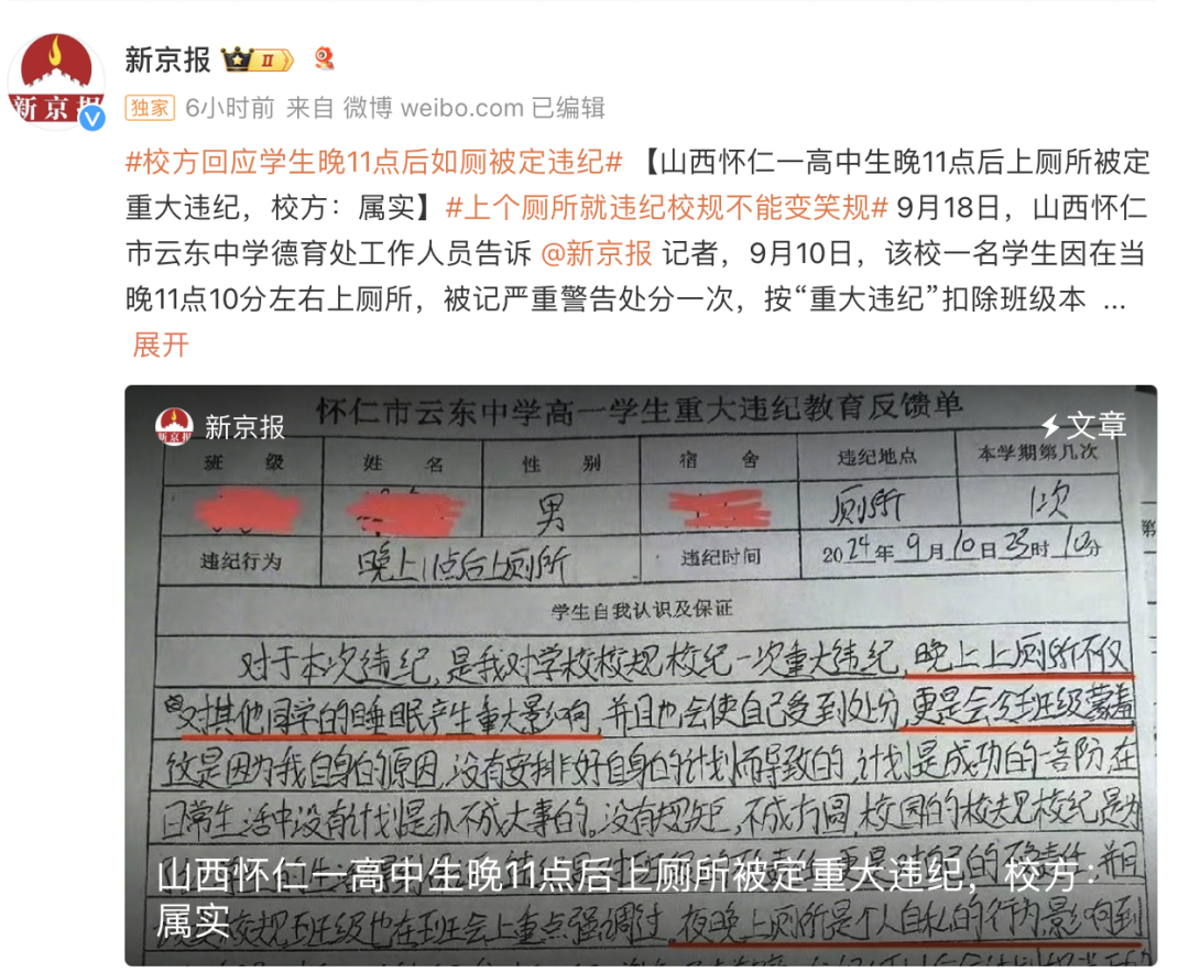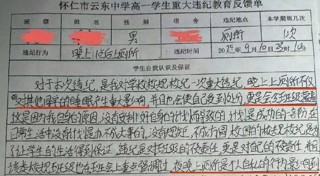 9月10日,該校一名學生因在當晚11點10分左右上廁所,被記嚴重警告處分一次,按“重大違紀”扣除班級本月德育考核成績5分,並自費打印“自我認識”1000份,分發至各班、各宿舍及各處室的情況屬實。