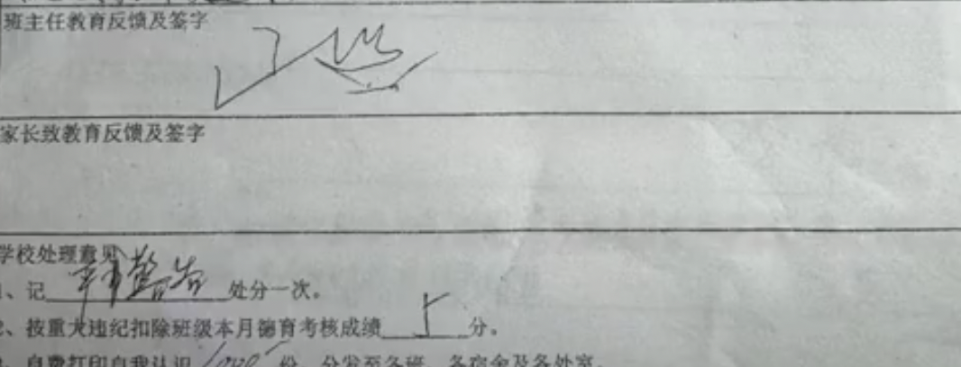 這個“改過自新”他強調了2次,而下面則是班主任的簽字;