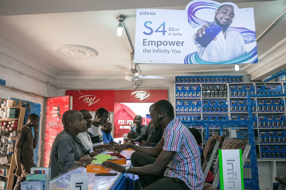 人行道旁的玻璃展示櫃裏,擺滿了英菲克移動(Infinix Mobility Ltd.)和伊泰爾移動(Itel Mobile Ltd.)的150美元以下智能手機。一條寬闊的橫幅上,展示着由非洲流行音樂巨星Burna Boy推薦的Oraimo SpacePods耳機。