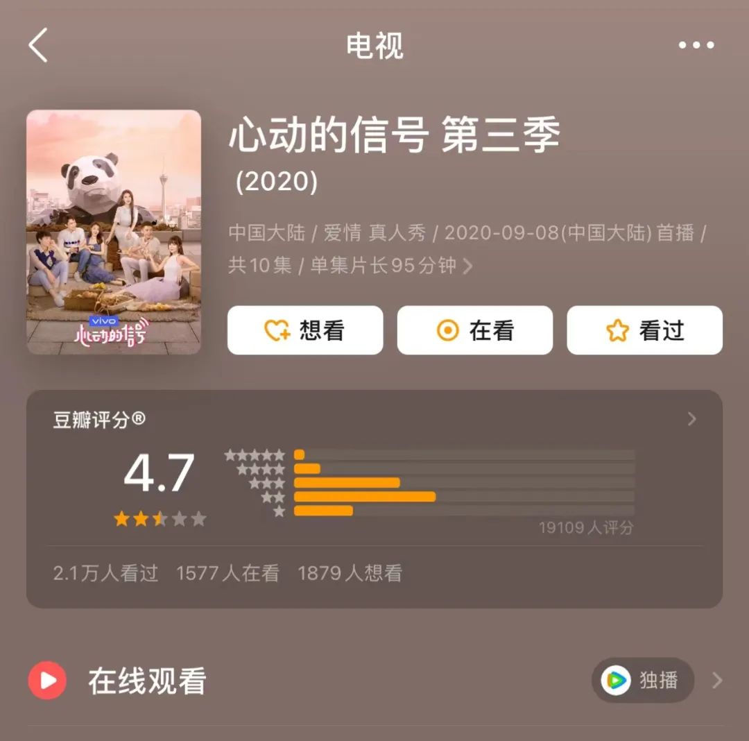 最終,《心動的信號3》口碑兩極分化,豆瓣評分僅有4.7分,是史上最低的一季,網友犀利吐槽:“作為×漂觀眾,除了感受到人與人之間的階級鴻溝,要如何投射和代入戀情養成的節目之中?”不過,雲合數據顯示,《心動的信號3》收視率在當年網綜裏排名Top1。