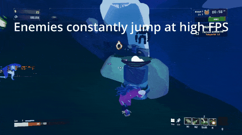 有些敵人在高幀率下倒是變笨了,只會反覆起跳停在原地。也許有一行代碼決定敵人每隔幾秒起跳一次,而過高的幀數大幅縮短了敵人的起跳間隔。