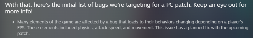 “遊戲中的許多元素都受到一個Bug的影響,這個Bug會導致它們的行為根據玩家的幀數而改變。這些要素包括物理系統、攻擊速度和移動。”