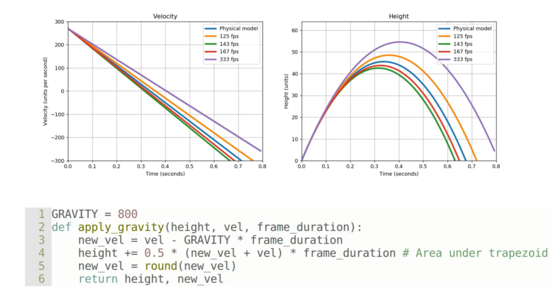 這是由遊戲結合重力計算玩家速度和向量的公式所決定的。以《雷神之錘3》舉例,在幀數設定為125幀時,玩家能夠跳躍至60幀環境下不可能到達的平台。因為這遊戲的速度計算公式在每幀最後都要進行一步四捨五入,而在125幀下得到的數據會取更多的“五入”,造成略高於預期的誤差。