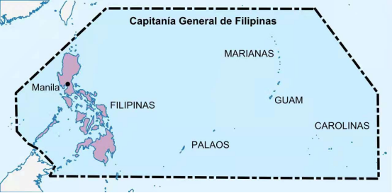 ▲西班牙殖民版圖,菲律賓位於亞洲東南亞地帶,圖中左下角
