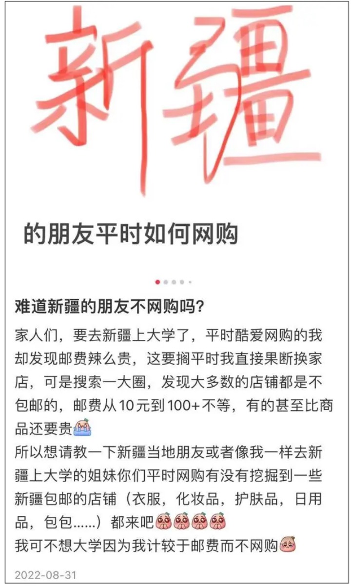 “難道新疆的朋友不網購嗎?”2022年8月底,博主“百事柯樂”在小紅書上發出了這樣一記靈魂拷問,引起了不少新疆網民的共鳴。