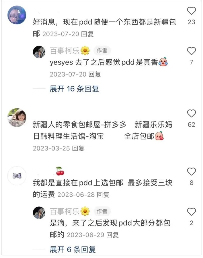 有意思的是,幾個月後,“百事柯樂”的帖子下方有些新疆網友留言:“好消息,現在pdd上隨便一個東西都是‘新疆包郵’”。她自己則回覆:“Yes,去了之後感覺pdd是真香。”