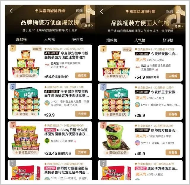 在方便速食食品需求的急劇下滑,以及消費者普遍的理性消費心態的趨勢中,今麥郎板面卻神奇的實現了逆勢飄紅,成為板面品類中的代表產品。數據顯示,從2023年11月,今麥郎板面在抖音平台爆火,連續蟬聯抖音電商平台銷量第一的位置,並霸佔了抖音商城桶裝方便麪爆款榜和人氣榜的雙料前兩名,天貓超市好評第二、熱銷第三。