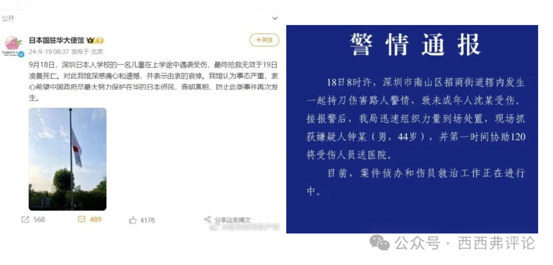 週三,一名10歲的學生在深圳一所日本人學校附近被刺傷,週四凌晨搶救無效去世。日本駐華大使館發了一則哀悼的微博,而深圳市公安局也發了通報。