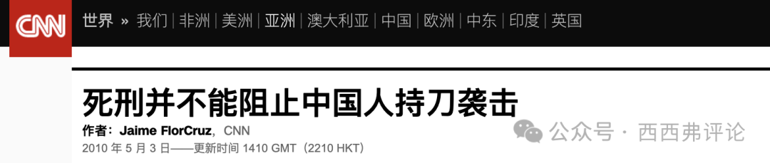 2010年,中國發生一起校園傷害案後,CNN的一則陰陽怪氣的報道稱“死刑並不能阻止中國人持刀襲擊”。死刑都不行,還有啥樣的嚴刑峻法能解決問題呢?