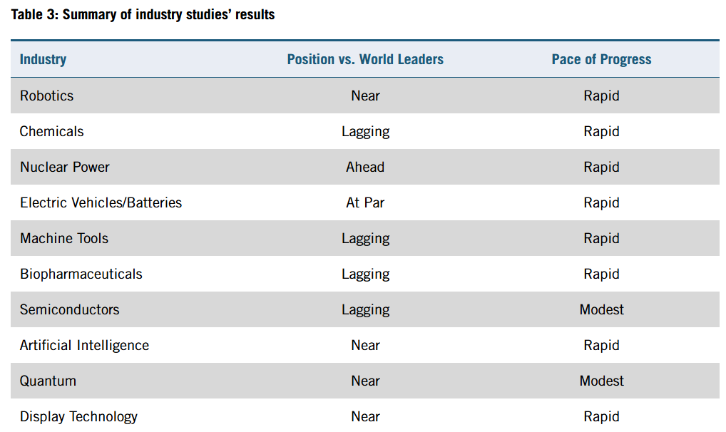 另外一個就是比較中國在10個行業上與美國等領先者的差距,結果是中國在2個行業中領先或持平(Ahead, At Par),在4個行業中接近領先(Near),在4個行業中落後(Lagging)。報告認為除了半導體和量子領域的進展受到設備出口管制的阻礙外,中國的進步速度令人震驚。
