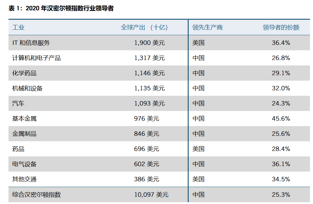 報告基於目前10個行業分別做了兩張對比表,一張是根據漢密爾頓指數得出的行業領導者情況,結果是中國在7個行業中領先,美國只有3個。