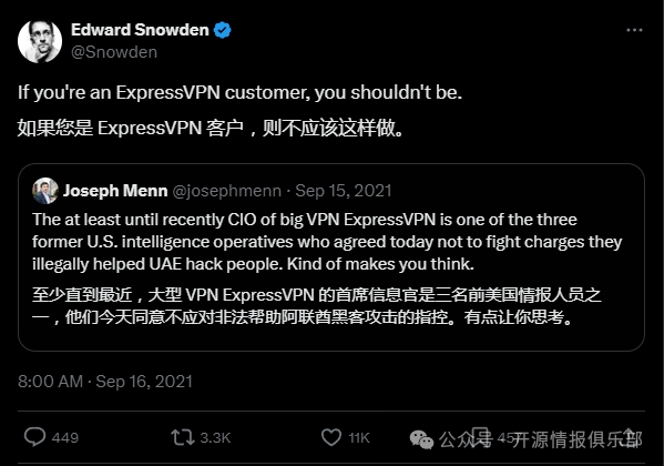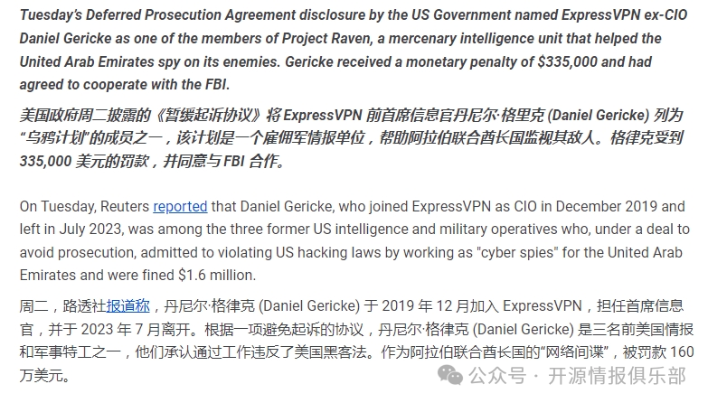 不幸的是,2019年至2023年擔任Express VPN首席技術官的丹尼爾·格律克 (Daniel Gericke)深度參與了此類可疑行為。路透社的一系列調查顯示,丹尼爾·格律克是一個名為“烏鴉計劃”間諜團伙的關鍵成員,該團伙是一個僱傭軍情報單位,幫助阿聯酋監視其敵人,其中入侵了人權活動家、記者和政府官員的設備,竊取了他們的數據並將其傳遞給阿聯酋政府。調查顯示,阿聯酋利用這些數據追蹤不同的政見者並對他們實施酷刑。