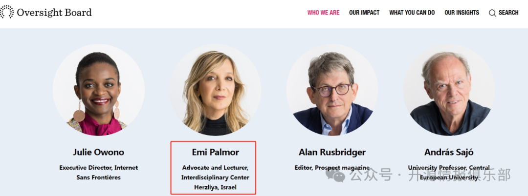 其中最主要的是埃米·帕爾默(Emi Palmor),她是一名長期在以色列國防軍服役的老兵,曾任以色列司法部局長,帕爾默是Meta監督委員會(Oversight Board)的21名成員之一,該委員會最終控制着Facebook、Instagram和Threads的政治方向,決定哪些內容是合適的,哪些內容是不可接受的,應該被禁止。