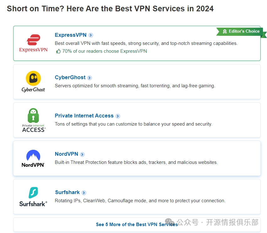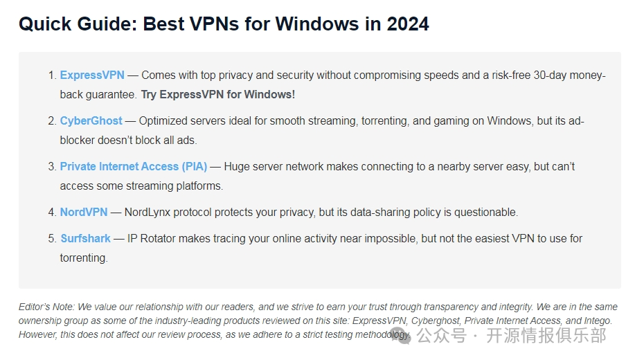 然而他們評選的2024年最佳VPN獎頒中前三款(基本上此排名固定不變,2023年排名也是如此)都給了Express VPN、Cyber Ghost和Private Internet Access,而這所有產品都是Kape Technologies公司旗下的產品。