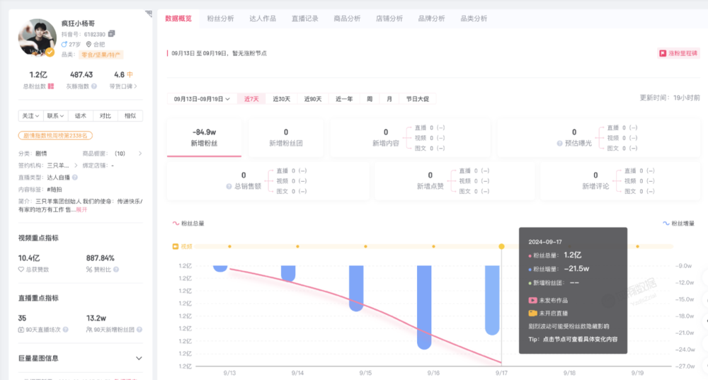 據灰豚數據統計,截至9月17日的一週內,瘋狂小楊哥賬號粉絲減少了超過80萬,30天內掉粉接近300萬,9月18日,瘋狂小楊哥賬號粉絲量跌落一億,三隻羊網絡粉絲為1134.8萬。
