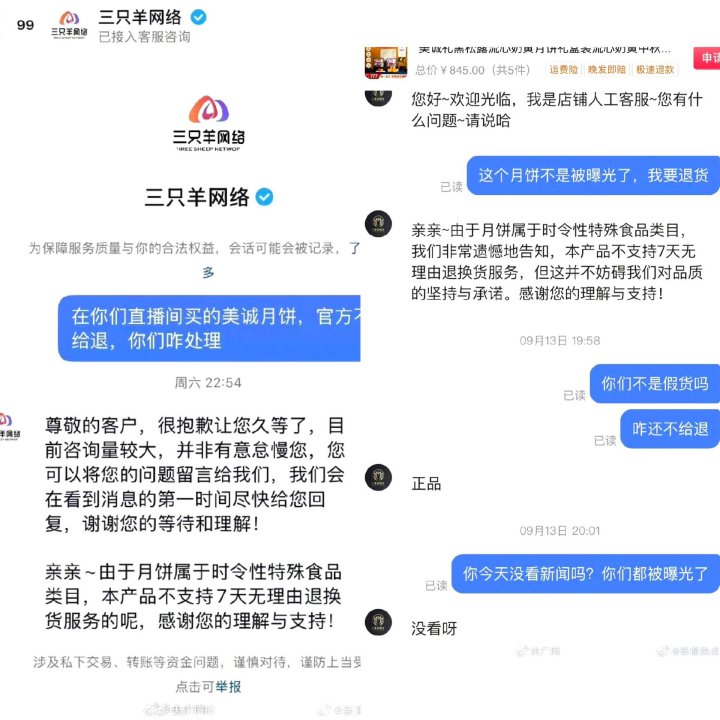 實際上美誠月餅就是個貼牌產品,人靠衣裝佛靠金裝,加上香港兩個字方便主播吹牛,但更深的追究似乎也做不到了。諸多發現被欺騙的消費者試圖退貨,但得到的回覆都是不支持七天無理由退貨。直播的時候一口一個家人叫的親,退貨就不認識家人了。