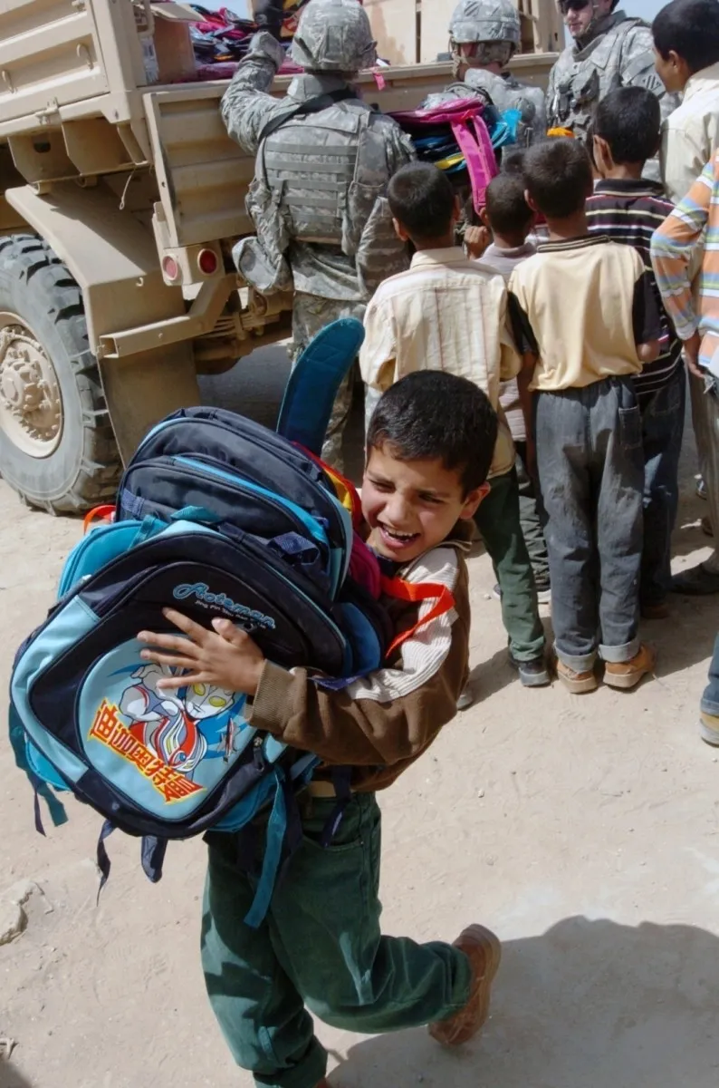 ▲2008年4月美國士兵進入伊拉克一所小學發放學習用品,小朋友領到的居然是中國生產的書包。****