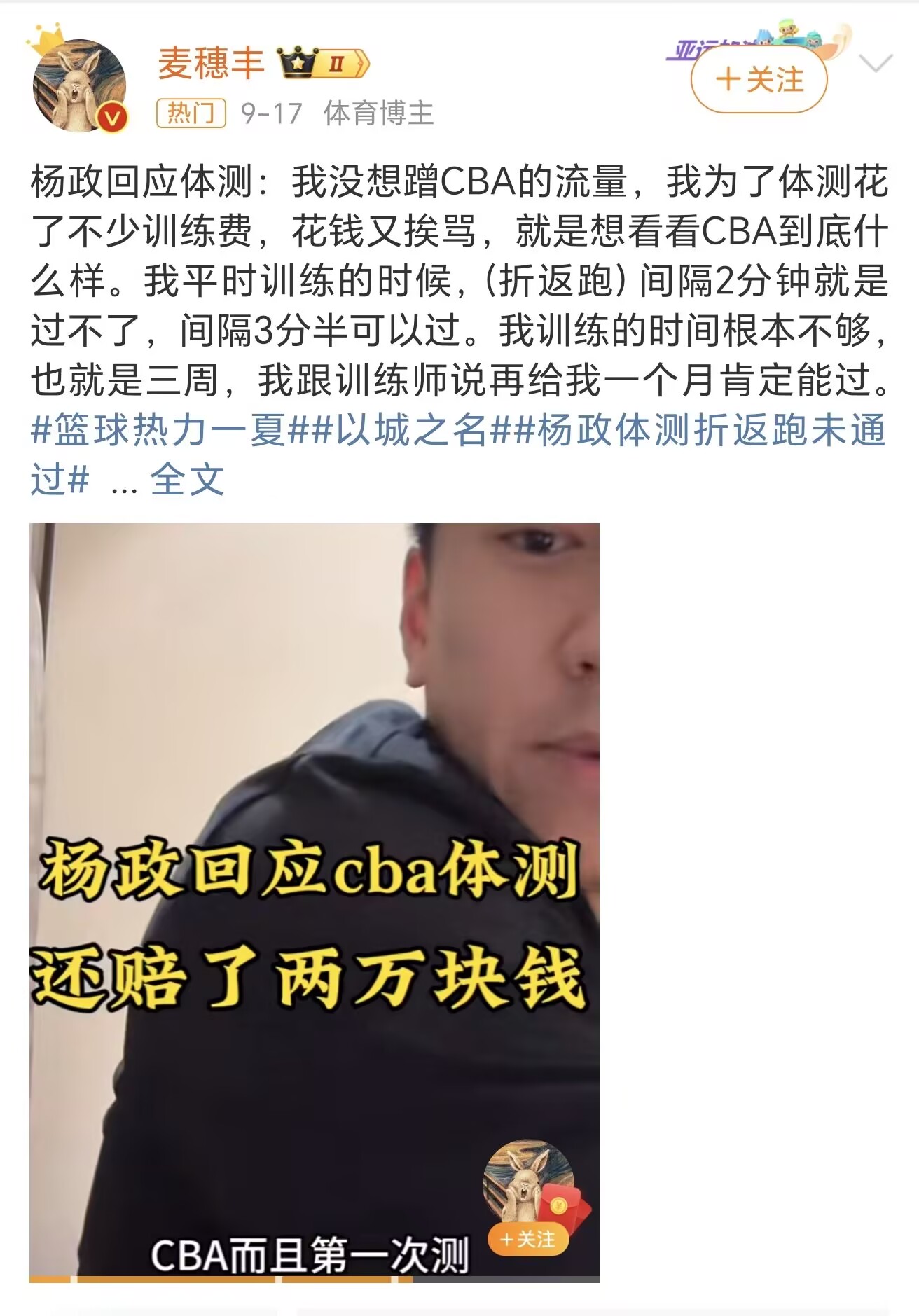 然而,就在楊政成為“第二輪狀元”後約一個月的時間,CBA公佈了新賽季球員的體測要求。據介紹,體測具體項目分別為:2分鐘強度投籃、負重卧推、負重深蹲和專項速度耐力四項。