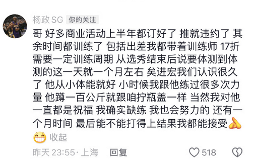 很多網友對於楊政的回應也是感到憤怒,他們認為CBA宣佈要體側的事並不是突然發生的。如果真的想要打職業,那麼在選修被選上的時候就應該早做準備了。