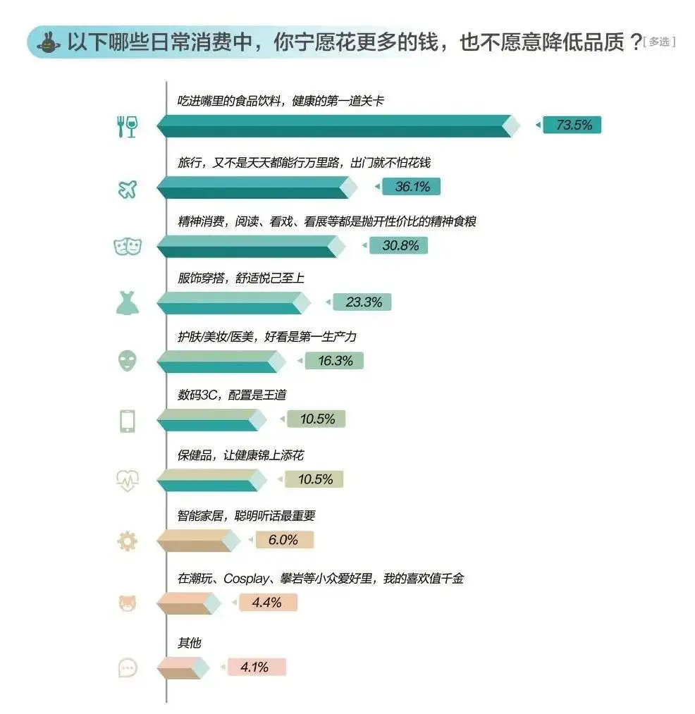 在中國新聞週刊日前發佈的《2024有意思生活方式報告》中,在“你可能格外為哪些因素買單”這一問題上,“是否是自己真正所需”以83.9%的得票率獲得斷層第一,其次才是折扣因素,第三是“能提供情緒價值”。而在“哪些日常消費品中,你寧願花更多錢也不願降低品質”上,七成以上受訪者選擇了食品飲料,排在後面的是旅遊、精神消費、服飾。可見,在真正的需求面前,價格並不是消費者的首選因素。