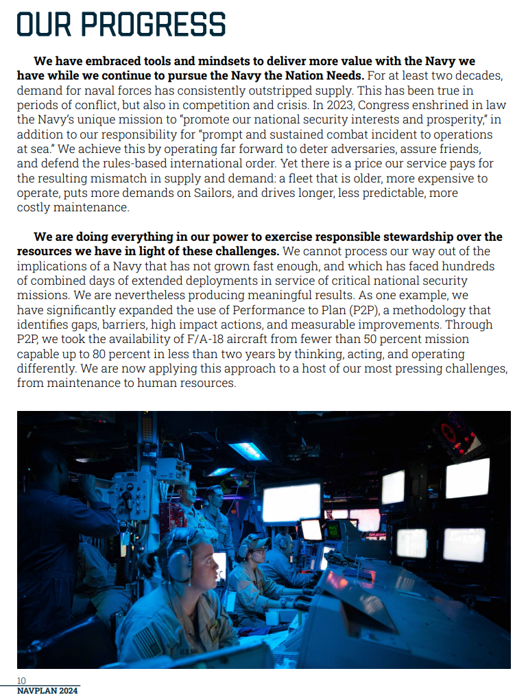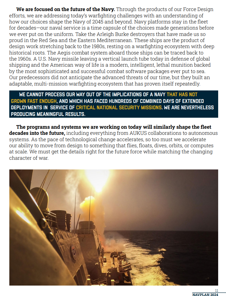 其核心思想也很簡單直接,我們美國海軍強而有力啊,在2027年一定會更加強而有力,但是得加錢,加人,加船,加船廠。其中對於中國部分的描述是,美國海軍的主要對手已經不僅限於中國海軍了。美國海軍受到的威脅來自於中國多軍種綜合作戰的體系,以及龐大的工業基礎。而美國無法維持一支規模足夠大的傳統海軍,即完成其在2023年提出的,到2040年代增加至並維持住381艘艦艇的規模。想要達到這一目標,務必保持預算增長,投資基建。
