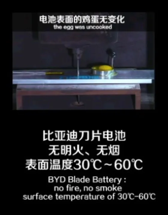 早在2020年,比亞迪刀片電池的發佈會上,為佐證“要將‘自燃’從電動汽車的字典裏抹去”的決心,比亞迪公開了刀片電池針刺試驗。從試驗結果來看,比亞迪的磷酸鐵鋰刀片電池在經歷了長達20分鐘左右的穿刺後,仍能做到無明火、無煙,表面温度30-60攝氏度。