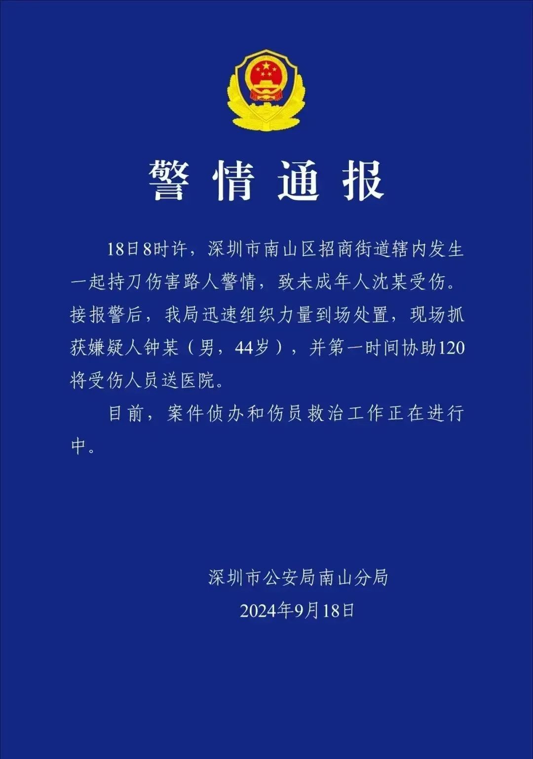 2024年9月18日,深圳發生一起兇案。一名44歲的男子鍾某,持刀襲擊了一個10歲的男孩沈某。次日,男孩不幸去世。