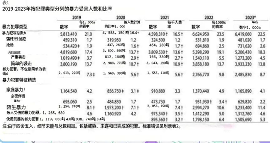 也就是説,嚴重暴力犯罪一年6.1萬人。考慮到有的可能是多人合作一案,也有的可能是一人做了多案,那麼粗暴評估,假設嚴重案件的件數和起訴罪犯人數相當,則我國一年發生的嚴重暴力犯罪大約6萬起。這個數字放世界範圍已經算比較低了。美國人口是中國的四分之一,2023年暴力犯罪高達600多萬起,其中強姦48萬起,造成受傷的100多萬起。日本治安比美國好得多,據日本警察廳公佈,2023年的重大犯罪也有1.2萬多起。