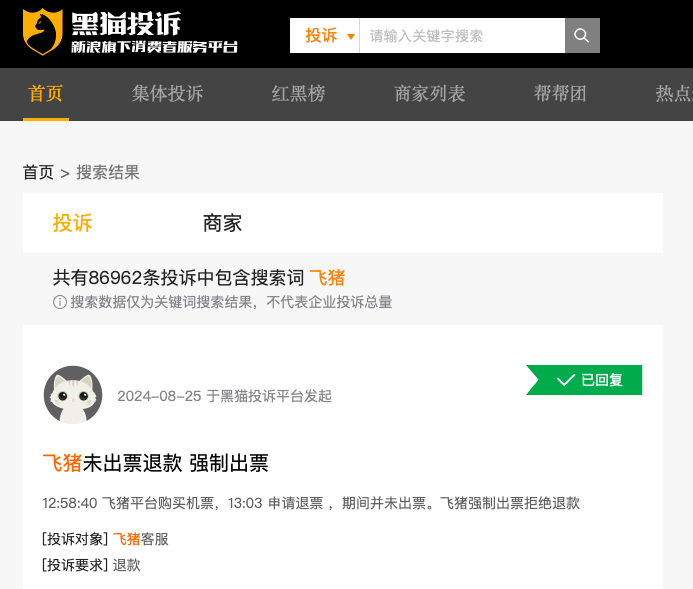 在黑貓投訴平台上,關於飛豬的投訴已超八萬條,多數集中在亂收費、拒絕退款、收取高額手續費等問題上。特別是預訂境外酒店時出現的差錯,如到店無房、名字拼寫錯誤等,更是讓消費者對飛豬的服務質量產生了嚴重質疑。