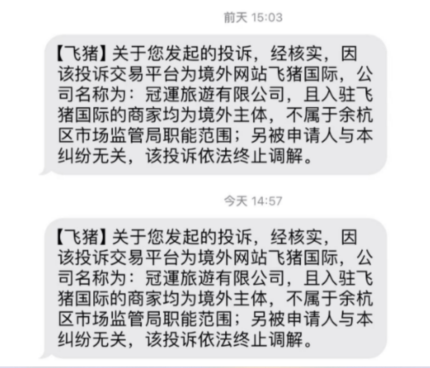 9月11日,杭州廣播電視台西湖之聲《1054 朋友圈》欄目曝光了飛豬平台在處理消費者投訴時的不當行為。多位消費者反映,在飛豬預訂境外酒店時遭遇訂單無效、拒絕補差價等問題,而飛豬客服的回覆短信竟以市場監管局的口吻,聲稱“不屬於餘杭區市場監管局職能範圍”,試圖終止調解。這種冒充國家機關的行為,不僅嚴重誤導了消費者,更觸犯了法律底線,引發了公眾的強烈不滿。