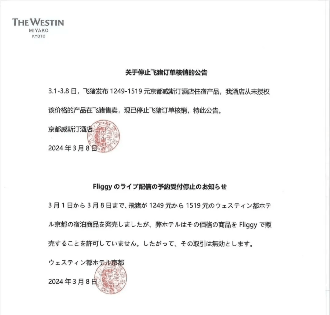 此外,今年3月1日,飛豬平台在官方微信公眾號推出,“京都威斯汀酒店1晚含早”套餐,券後價1499元起;8日,飛豬再度發文稱,在1499元的基礎上將再降150元,併疊加100元券(限時限量)。然而,飛豬的虛假宣傳很快就被揭穿。3月8日京都威斯汀酒店發聲明稱,並未授權該價格的產品在飛豬售賣,現已停止飛豬訂單核銷。