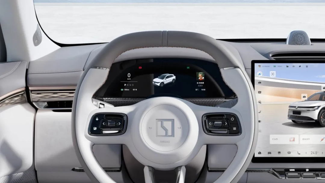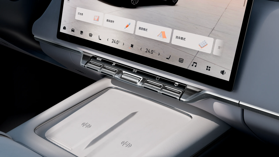 7X 的方向盤用的不是 X 和 007 同款的搖桿 + 觸摸,而是和 001 一樣的全物理按鍵。中控台的下方也有五個質感看着還不錯的物理按鈕,可以調節駕駛模式、音樂,也可以把自定義按鍵綁給空調調節温度。